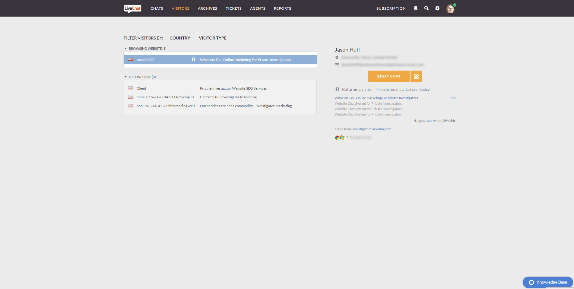 LiveChat is an online chat solution that helps you connect with your website visitors. When using LiveChat, you can see in real time the way visitors navigate your website, then approach them on each step of the buying process. So rather than having a visitor come to your website looking for investigation services and leaving because they can’t figure out what they need, you can give them the opportunity to chat with you directly – or you can engage them directly and see if they need any help.